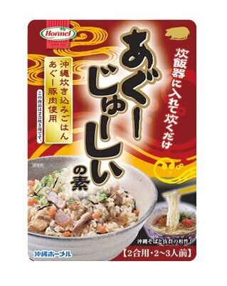 ①お米2合を洗い、通常の水加減にし、「あぐーじゅーしぃーの素」をいれてよくかき混ぜて炊きあげてください。